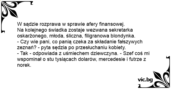 Na kolejnego świadka zostaje wezwana sekretarka oskarżonego, młoda, śliczna, filigranowa blondynka.
