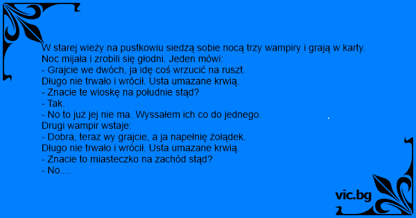 W starej wieży na pustkowiu siedzą sobie nocą trzy wampiry i grają w karty. Noc mijała i zrobili się głodni. Jeden mówi: