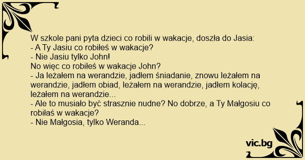 W szkole pani pyta dzieci co robili w wakacje, doszła do Jasia: