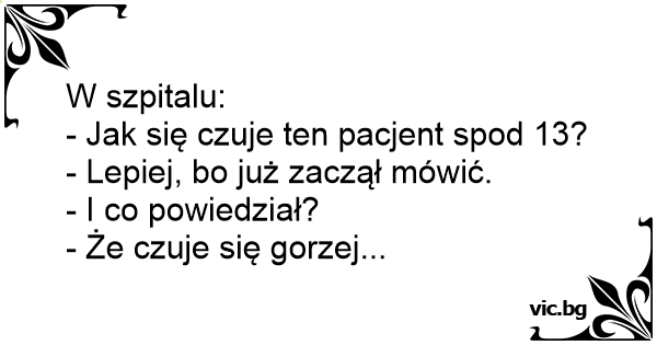 W szpitalu:<br />- Jak się czuje ten pacjent spod 13?<br />- Lepiej, bo już zaczął mówić.<br />- I co powiedział?<br />- Że czuje się gorzej...