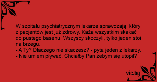 W szpitalu psychiatrycznym lekarze sprawdzają, który z pacjentów jest już zdrowy. Każą wszystkim skakać do pustego basenu. Wszyscy skoczyli, tylko jeden stoi na brzegu.