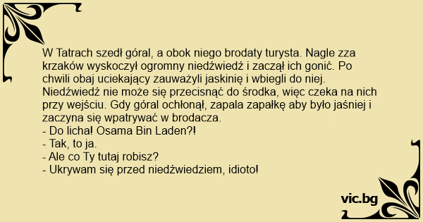 W Tatrach szedł góral, a obok niego brodaty turysta. Nagle zza krzaków wyskoczył ogromny niedźwiedź i zaczął ich gonić. Po chwili obaj uciekający zauważyli jaskinię i wbiegli do niej. Niedźwiedź nie może się przecisnąć do środka, więc czeka na nich przy wejściu. Gdy góral ochłonął, zapala zapałkę aby było jaśniej i zaczyna się wpatrywać w brodacza.