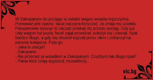 W Zakopanym do pociągu w ostatni wagon wsiada mężczyzna. Ponieważ jest ciasno, facet zaczyna krzyczeć, że żmija mu uciekła. Pasażerowie słysząc to zaczęli uciekać do przodu pociąg. Gdy już cały wagon był pusty, facet zajął przedział, położył się i zasnął. Spał bardzo długo, a gdy się obudził wyjrzał przez okno i zobaczył na peronie kolejarza. Pyta go: