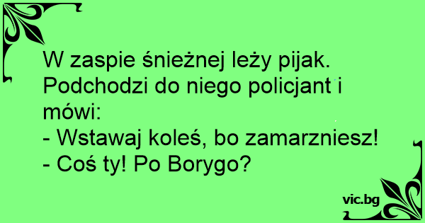 W zaspie śnieżnej leży pijak. Podchodzi do niego policjant i mówi: