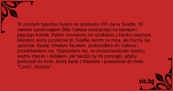 "Cześć, Krzysiu". Zgodził się. 10 minut później, kiedy rozmawiałem z klientem, poczułem klepnięcie w ramię. To był Bill Gates. Odwróciłem się i spojrzałem na niego.