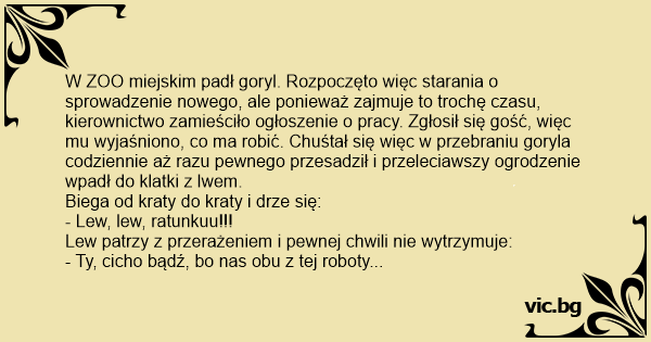 W ZOO miejskim padł goryl. Rozpoczęto więc starania o sprowadzenie nowego, ale ponieważ zajmuje to trochę czasu, kierownictwo zamieściło ogłoszenie o pracy. Zgłosił się gość, więc mu wyjaśniono, co ma robić. Chuśtał się więc w przebraniu goryla codziennie aż razu pewnego przesadził i przeleciawszy ogrodzenie wpadł do klatki z lwem.
