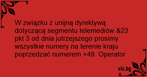 W związku z unijną dyrektywą dotyczącą segmentu telemediów &23 pkt 3 od dnia jutrzejszego prosimy wszystkie numery na terenie kraju poprzedzać numerem +49. Operator