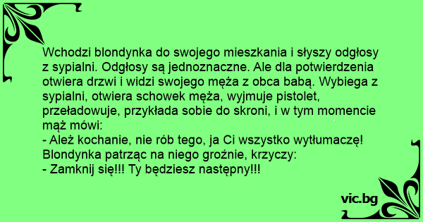 Wchodzi blondynka do swojego mieszkania i słyszy odgłosy z sypialni. Odgłosy są jednoznaczne. Ale dla potwierdzenia otwiera drzwi i widzi swojego męża z obca babą. Wybiega z sypialni, otwiera schowek męża, wyjmuje pistolet, przeładowuje, przykłada sobie do skroni, i w tym momencie mąż mówi: