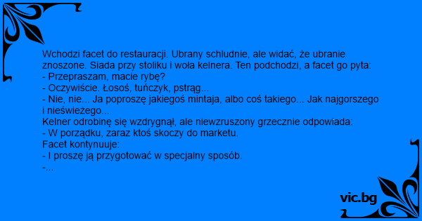 - I jak będzie mi pan rybę podawał, to proszę bez żadnych kurtuazyjnych "smacznego", "proszę bardzo"; czy innych. Proszę rzucić talerz na stół i warknąć: