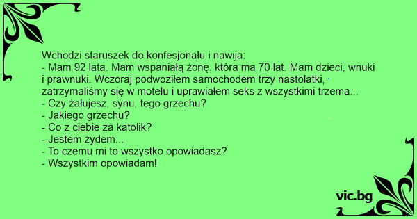 Stařec vejde do zpovědnice: „Otče, je mi osmdesát, jsem šedesát let ženat, mám čtyři děti, šestnáct vnoučat a asi šedesát pravnoučat, takže bych měl mít už rozum. Ale včera, co se mi stalo - pařil...