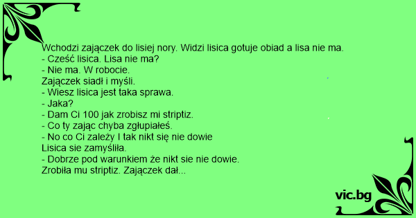 Lisica się zgodziła. Przespała się z zajączkiem dostała kolejne 100. Zajączek poszedł do domu. Wieczorem do lisiej nory z pracy wraca lis. Siada, je obiad: