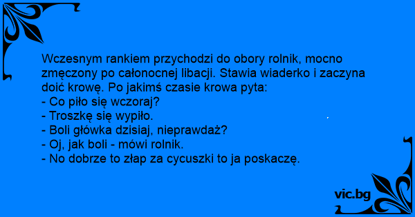 Wczesnym rankiem przychodzi do obory rolnik, mocno zmęczony po całonocnej libacji. Stawia wiaderko i zaczyna doić krowę. Po jakimś czasie krowa pyta: