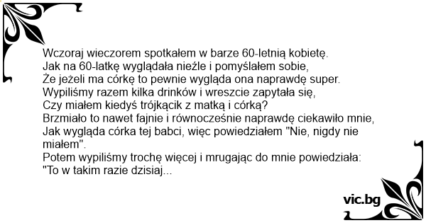 Wczoraj wieczorem spotkałem w barze 60-letnią kobietę.
