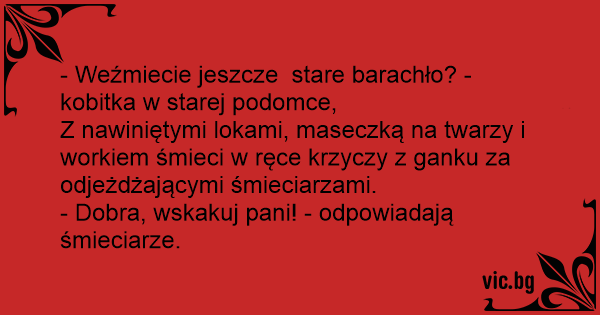 - Weźmiecie jeszcze stare barachło? - kobitka w starej podomce,