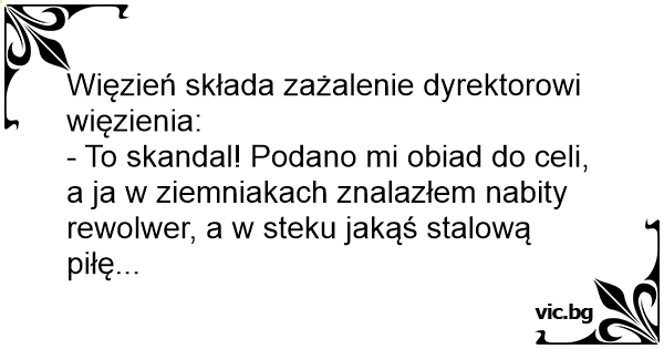 - To skandal! Podano mi obiad do celi, a ja w ziemniakach znalazłem nabity rewolwer, a w steku jakąś stalową piłę...