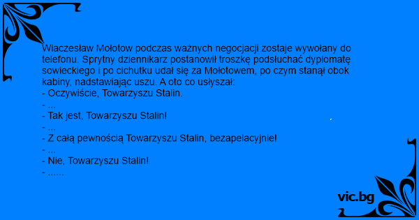 Wiaczesław Mołotow podczas ważnych negocjacji zostaje wywołany do telefonu. Sprytny dziennikarz postanowił troszkę podsłuchać dyplomatę sowieckiego i po cichutku udał się za Mołotowem, po czym stanął obok kabiny, nadstawiając uszu. A oto co usłyszał: