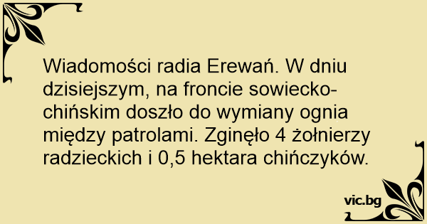 Wiadomości radia Erewań. W dniu dzisiejszym, na froncie sowiecko-chińskim doszło do wymiany ognia między patrolami. Zginęło 4 żołnierzy radzieckich i 0,5 hektara chińczyków.