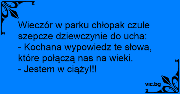 Mladík v parku objímá svoji dívku a něžně jí šeptá do ouška: „Drahoušku, řekni mi alespoň dvě slova, která nás navždy spojí!” „Jsem těhotná!”