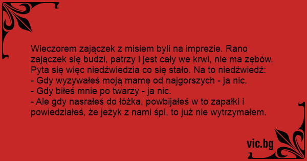 Wieczorem zajączek z misiem byli na imprezie. Rano zajączek się budzi, patrzy i jest cały we krwi, nie ma zębów. Pyta się więc niedźwiedzia co się stało. Na to niedźwiedź: