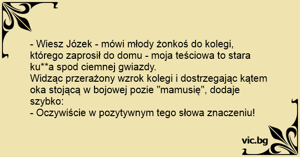 - Wiesz Józek - mówi młody żonkoś do kolegi, którego zaprosił do domu - moja teściowa to stara ku**a spod ciemnej gwiazdy.