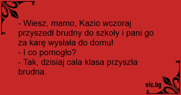 - Wiesz, mamo, Kazio wczoraj przyszedł brudny do szkoły i pani go za karę wysłała do domu!