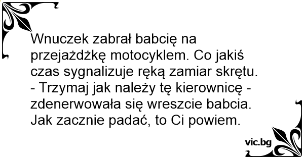 Wnuczek zabrał babcię na przejażdżkę motocyklem. Co jakiś czas sygnalizuje ręką zamiar skrętu.