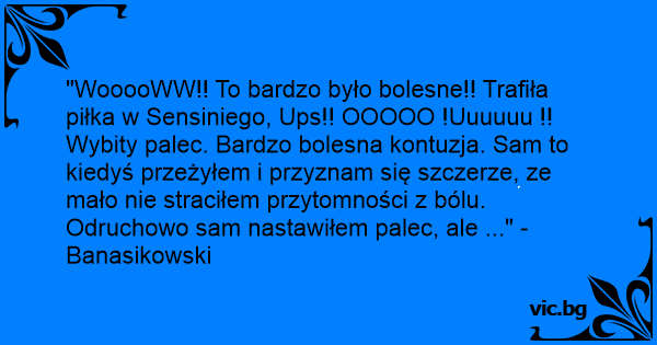 "WooooWW!! To bardzo było bolesne!! Trafiła piłka w Sensiniego, Ups!! OOOOO !Uuuuuu !! Wybity palec. Bardzo bolesna kontuzja. Sam to kiedyś przeżyłem i przyznam się szczerze, ze mało nie straciłem przytomności z bólu. Odruchowo sam nastawiłem palec, ale ..." - Banasikowski