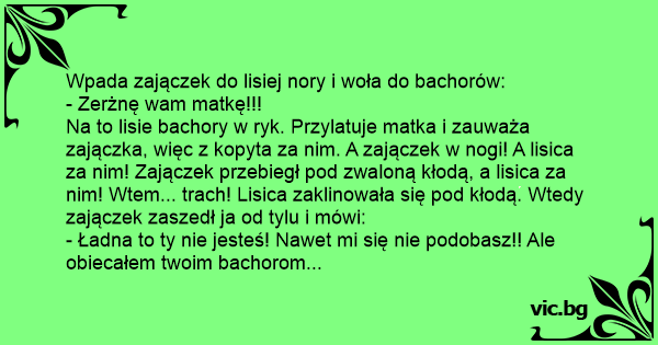 Wpada zajączek do lisiej nory i woła do bachorów: