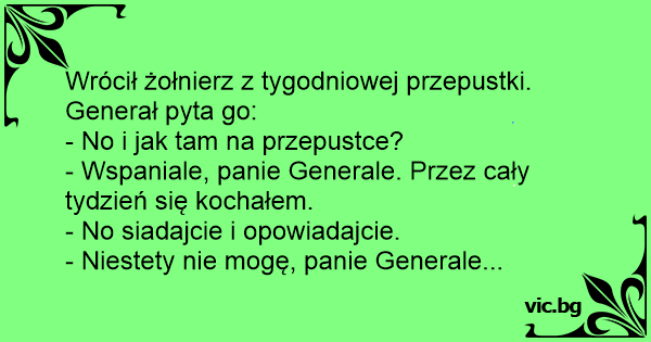 Wrócił żołnierz z tygodniowej przepustki. Generał pyta go: