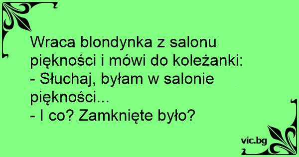 Lucía viene del esteticista Откъде идваш? - Здрасти, от къде идваш? Трпана се враќа дома, Трпе ја прашува: Minha mulher chegou do salão de beleza toda feliz olhou pra mim e perguntou: "Schatz, ich war heute den ganzen Vormittag im Schönheitssalon..." "Ach, und warum bist Du nicht drangekommen?" На Дерибасівській зустрічаються дві дами: — Сарочка, ти нічого не помічаєш? — Ні, а що? — Я була в косметичному салоні. — І шо?.. Було закрито? Un retraité attend sa femme partie à l'institut de beauté. Au bout de 3 h elle revient et il lui demande: c'était fermé? Mevrouw Popjes komt thuis en zegt tegen haar man: 'Ik kom net van de schoonheidssalon.' 'O ja?' antwoord haar man. 'Waarom ben je niet aan de beurt gekomen?' Зустрічаються дві подруги. — Привіт, ти де була? — Ходила до салону краси. — Ну і що, він закритий був? Hazaérve mondja az asszony a férjének: - Most jövök a szépségszalonból. - Zárva volt? - Skąd wracasz? - Z salonu piękności! - Był zamknięty?! Du vyrukai bare kirkina merginą: - Panele, o jūs, turbūt, grožio salone buvote? - Taip, - sako ta, - o ką? - Uždaryta buvo, ane? - Aunt Teresa, where do you come from? - - From the Beauty Salon. - - It was closed, right? Gražus vaikinas prieina prie merginos tyrom akim, pažvelgia jai į veidą ir romantiškai klausia: - Jūs grožio salone buvote? - Taip... - atsako toji virpėdama. - Pasirodė uždarytas, AR NE?..