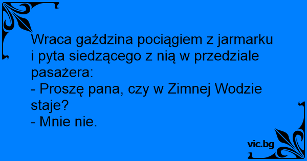 Wraca gaździna pociągiem z jarmarku i pyta siedzącego z nią w przedziale pasażera: