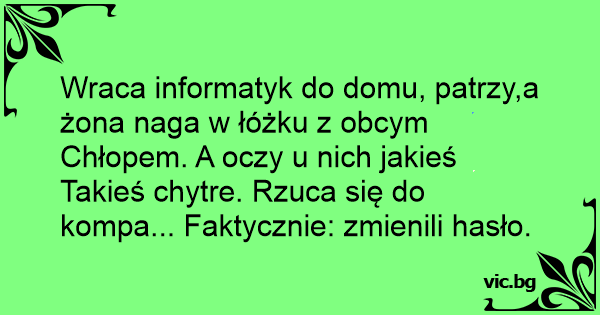 Wraca informatyk do domu, patrzy,a żona naga w łóżku z obcym Chłopem. A oczy u nich jakieś Takieś chytre. Rzuca się do kompa... Faktycznie: zmienili hasło.