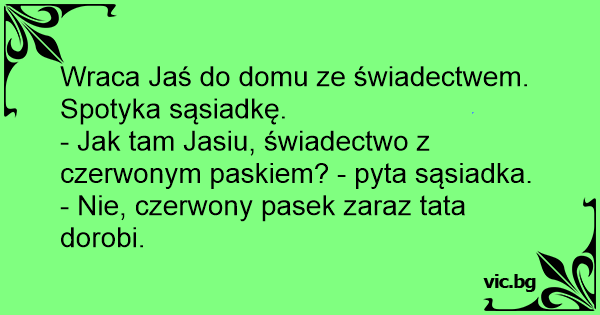 - Jak tam Jasiu, świadectwo z czerwonym paskiem? - pyta sąsiadka.