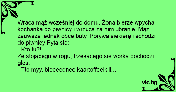 Wraca mąż wcześniej do domu. Żona bierze wpycha kochanka do piwnicy i wrzuca za nim ubranie. Mąż zauważa jednak obce buty. Porywa siekierę i schodzi do piwnicy Pyta się: