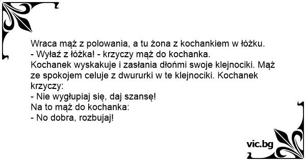 Wraca mąż z polowania, a tu żona z kochankiem w łóżku.
