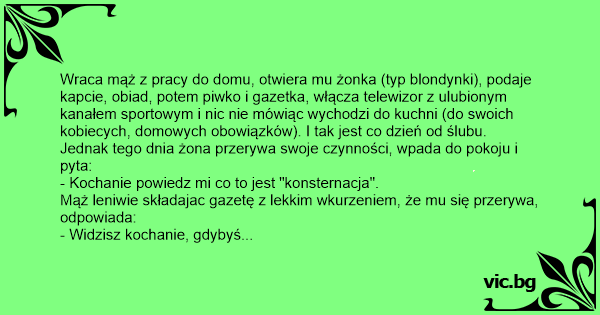 Wraca mąż z pracy do domu, otwiera mu żonka (typ blondynki), podaje kapcie, obiad, potem piwko i gazetka, włącza telewizor z ulubionym kanałem sportowym i nic nie mówiąc wychodzi do kuchni (do swoich kobiecych, domowych obowiązków). I tak jest co dzień od ślubu.