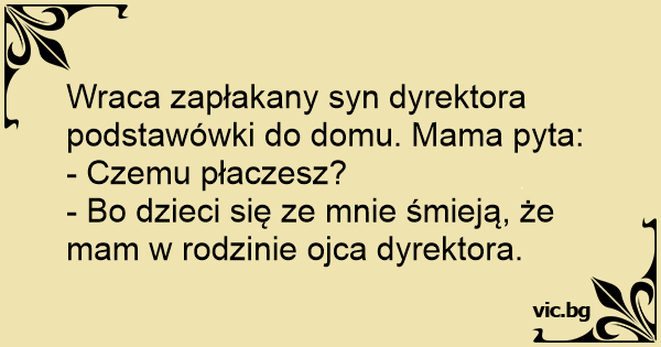 Wraca zapłakany syn dyrektora podstawówki do domu. Mama pyta: