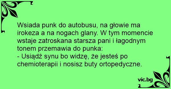 Wsiada punk do autobusu, na głowie ma irokeza a na nogach glany. W tym momencie wstaje zatroskana starsza pani i łagodnym tonem przemawia do punka: