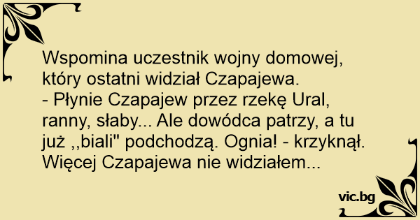 - Płynie Czapajew przez rzekę Ural, ranny, słaby... Ale dowódca patrzy, a tu już ,,biali'' podchodzą. Ognia! - krzyknął. Więcej Czapajewa nie widziałem...