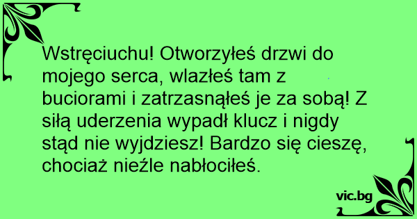 Wstręciuchu! Otworzyłeś drzwi do mojego serca, wlazłeś tam z buciorami i zatrzasnąłeś je za sobą! Z siłą uderzenia wypadł klucz i nigdy stąd nie wyjdziesz! Bardzo się cieszę, chociaż nieźle nabłociłeś.
