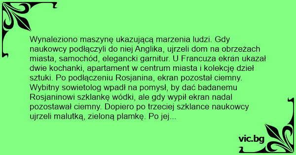 Wybitny sowietolog wpadł na pomysł, by dać badanemu Rosjaninowi szklankę wódki, ale gdy wypił ekran nadal pozostawał ciemny. Dopiero po trzeciej szklance naukowcy ujrzeli malutką, zieloną plamkę. Po jej powiększeniu okazało się, że jest to malutki ogóreczek.