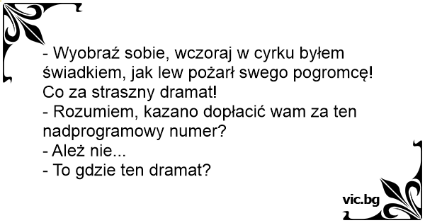 - Wyobraź sobie, wczoraj w cyrku byłem świadkiem, jak lew pożarł swego pogromcę! Co za straszny dramat!