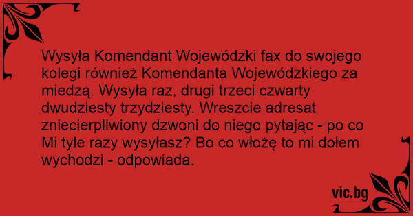 Wysyła Komendant Wojewódzki fax do swojego kolegi również Komendanta Wojewódzkiego za miedzą. Wysyła raz, drugi trzeci czwarty dwudziesty trzydziesty. Wreszcie adresat zniecierpliwiony dzwoni do niego pytając - po co