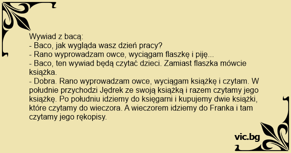 - Dobra. Rano wyprowadzam owce, wyciągam książkę i czytam. W południe przychodzi Jędrek ze swoją książką i razem czytamy jego książkę. Po południu idziemy do księgarni i kupujemy dwie książki, które czytamy do wieczora. A wieczorem idziemy do Franka i tam czytamy jego rękopisy.