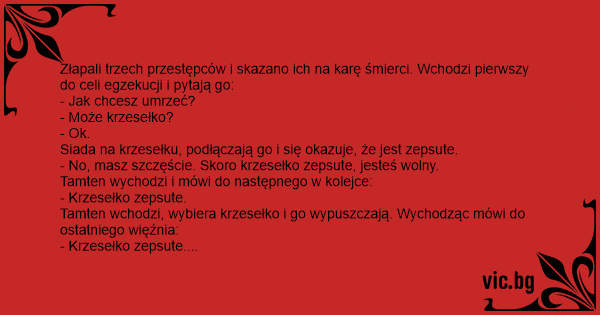 Złapali trzech przestępców i skazano ich na karę śmierci. Wchodzi pierwszy do celi egzekucji i pytają go:
