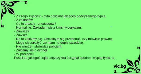 - Z czego żyjecie? - pyta policjant jakiegoś podejrzanego typka.