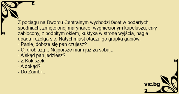Z pociągu na Dworcu Centralnym wychodzi facet w podartych spodniach, zmiętolonej marynarce, wygniecionym kapeluszu, cały zabłocony, z podbitym okiem, kuśtyka w stronę wyjścia, nagle upada i czołga się. Natychmiast otacza go grupka gapiów.