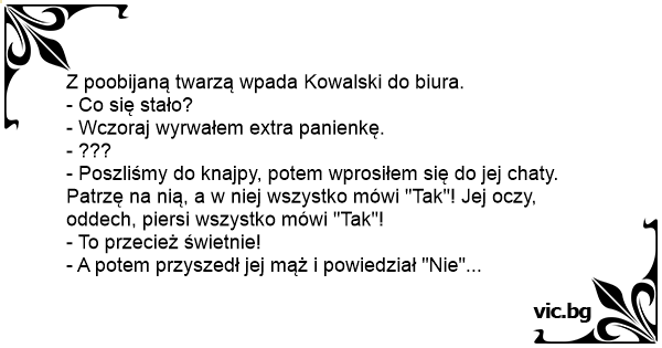 Z poobijaną twarzą wpada Kowalski do biura.