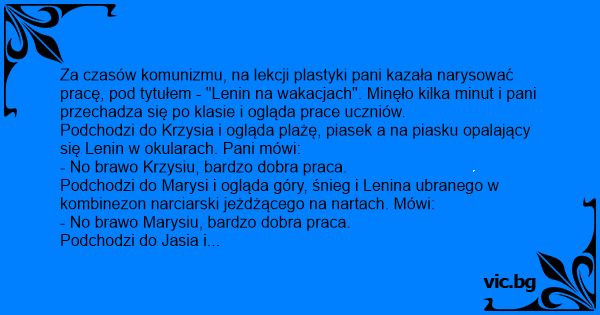 Za czasów komunizmu, na lekcji plastyki pani kazała narysować pracę, pod tytułem - "Lenin na wakacjach". Minęło kilka minut i pani przechadza się po klasie i ogląda prace uczniów.