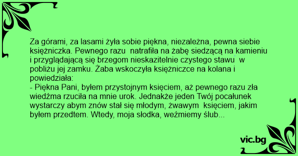 - Piękna Pani, byłem przystojnym księciem, aż pewnego razu zła wiedźma rzuciła na mnie urok. Jednakże jeden Twój pocałunek wystarczy abym znów stał się młodym, żwawym księciem, jakim byłem przedtem. Wtedy, moja słodka, weźmiemy ślub i będziemy razem z moją matką gospodarować w tym zamku. Tam będziesz przygotowywać mi posiłki, prać moje ubranie, rodzić mi dzieci, i będziemy żyli długo i szczęśliwie...
